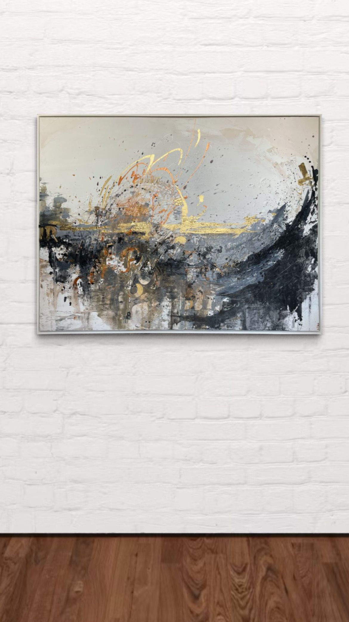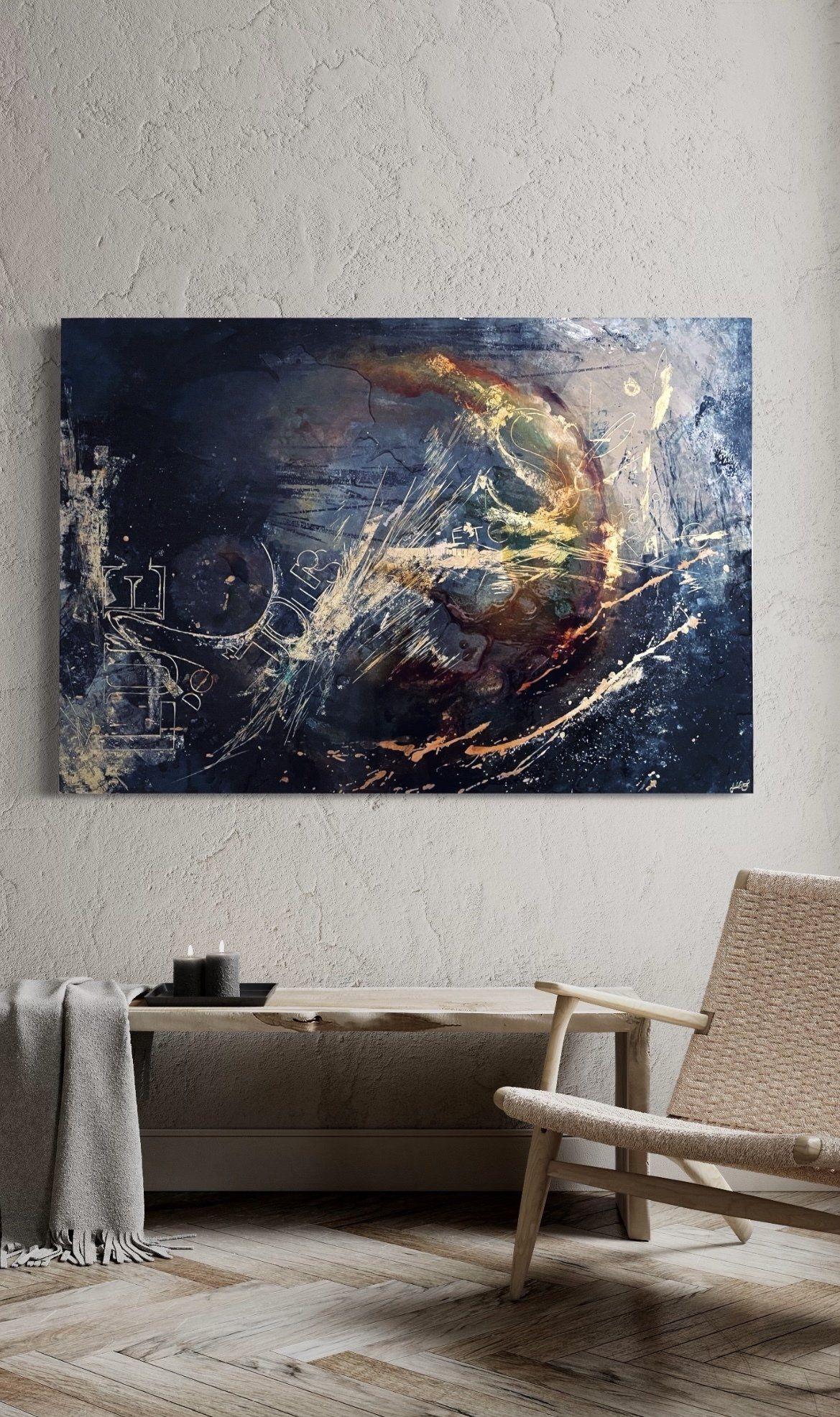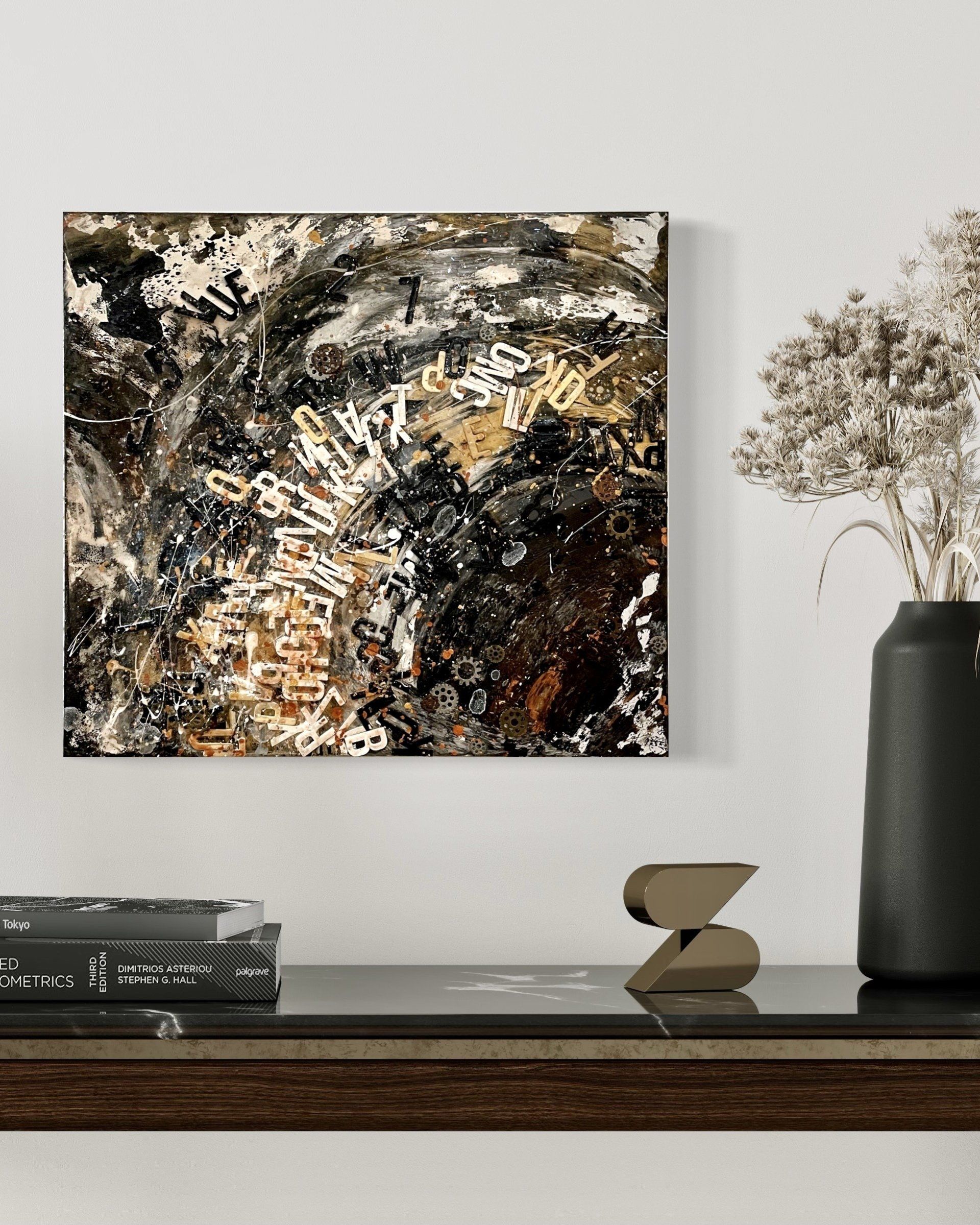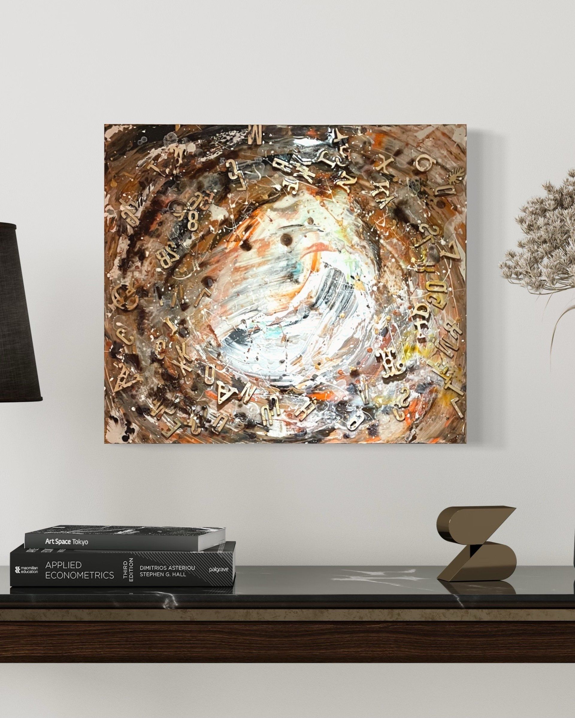 Composition de lettres superposées, Peinture acrylique et à l'alcool rehaussé par de la résine et de la dorure à la feuille d'or