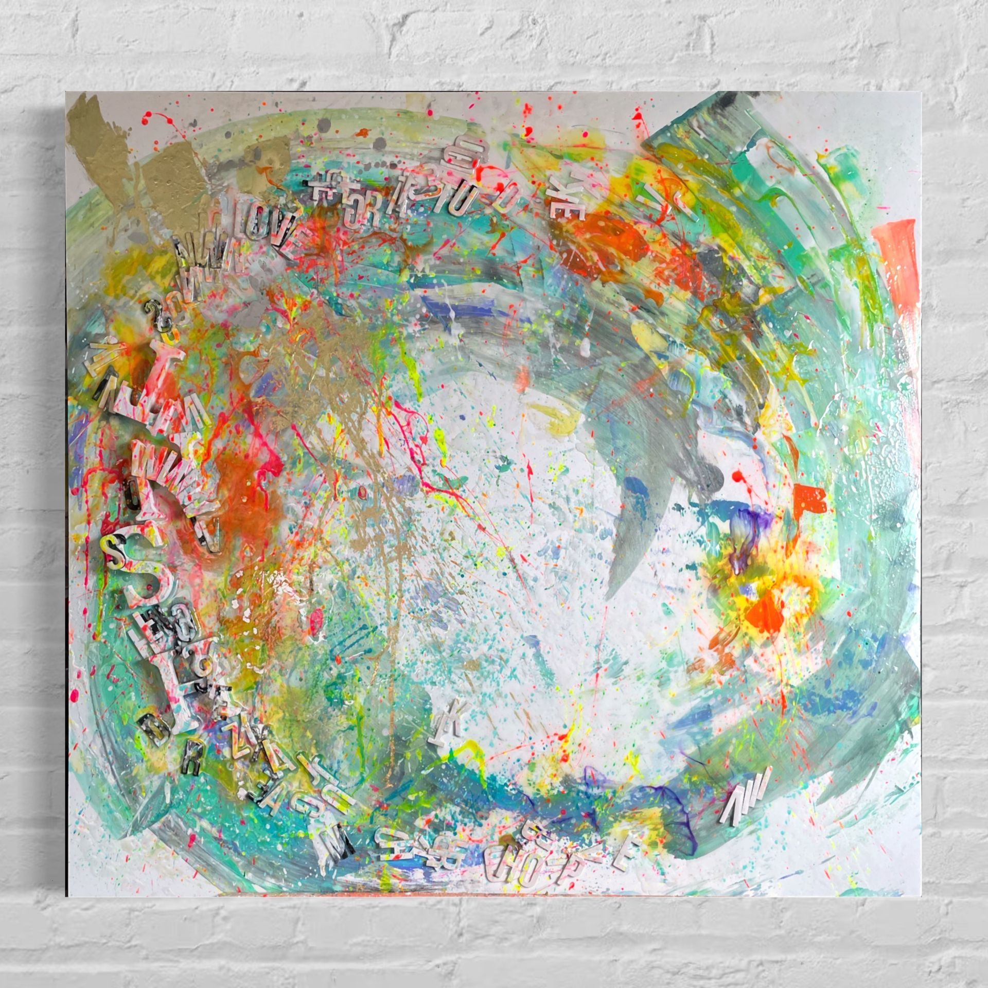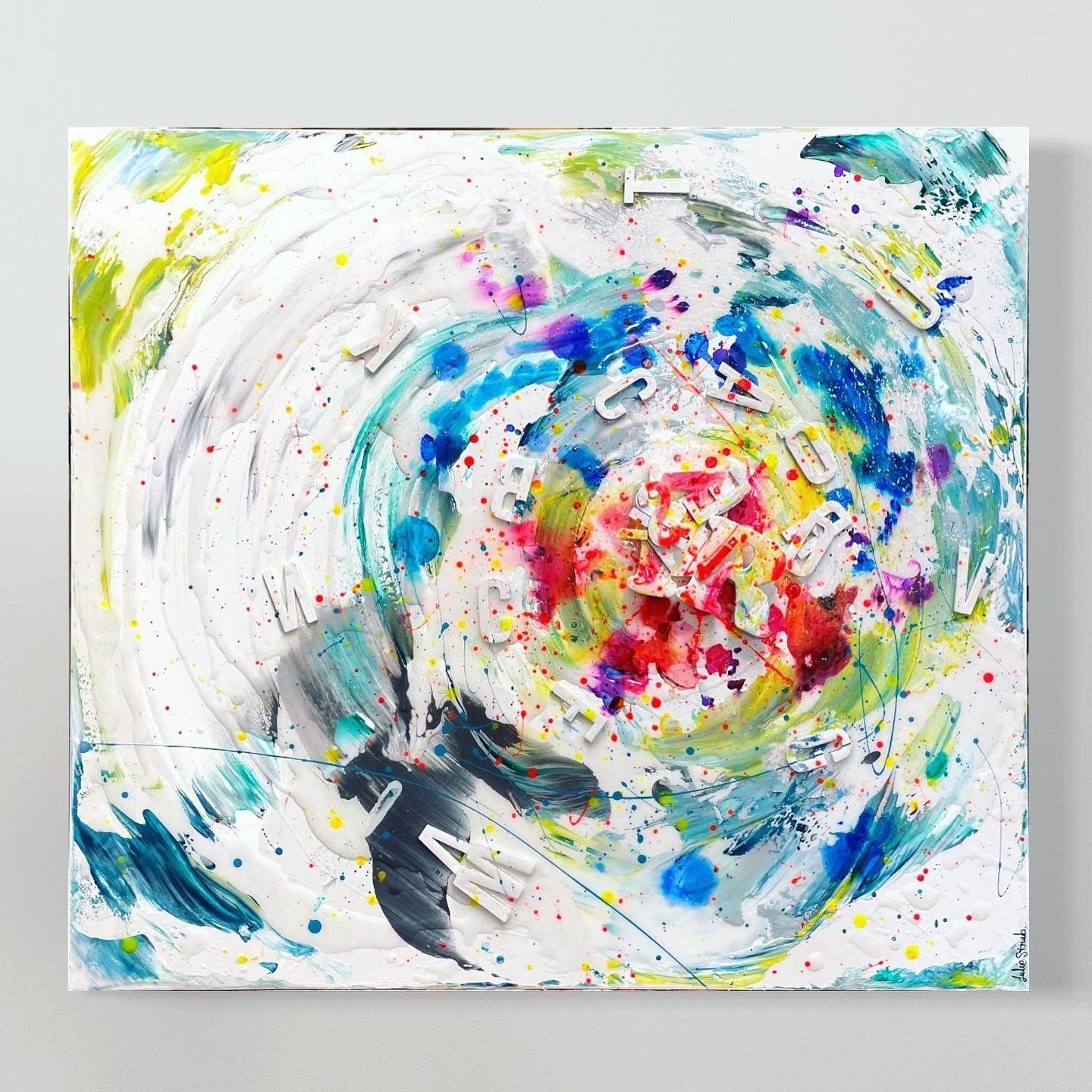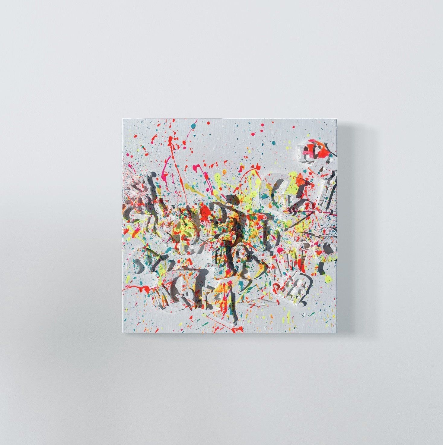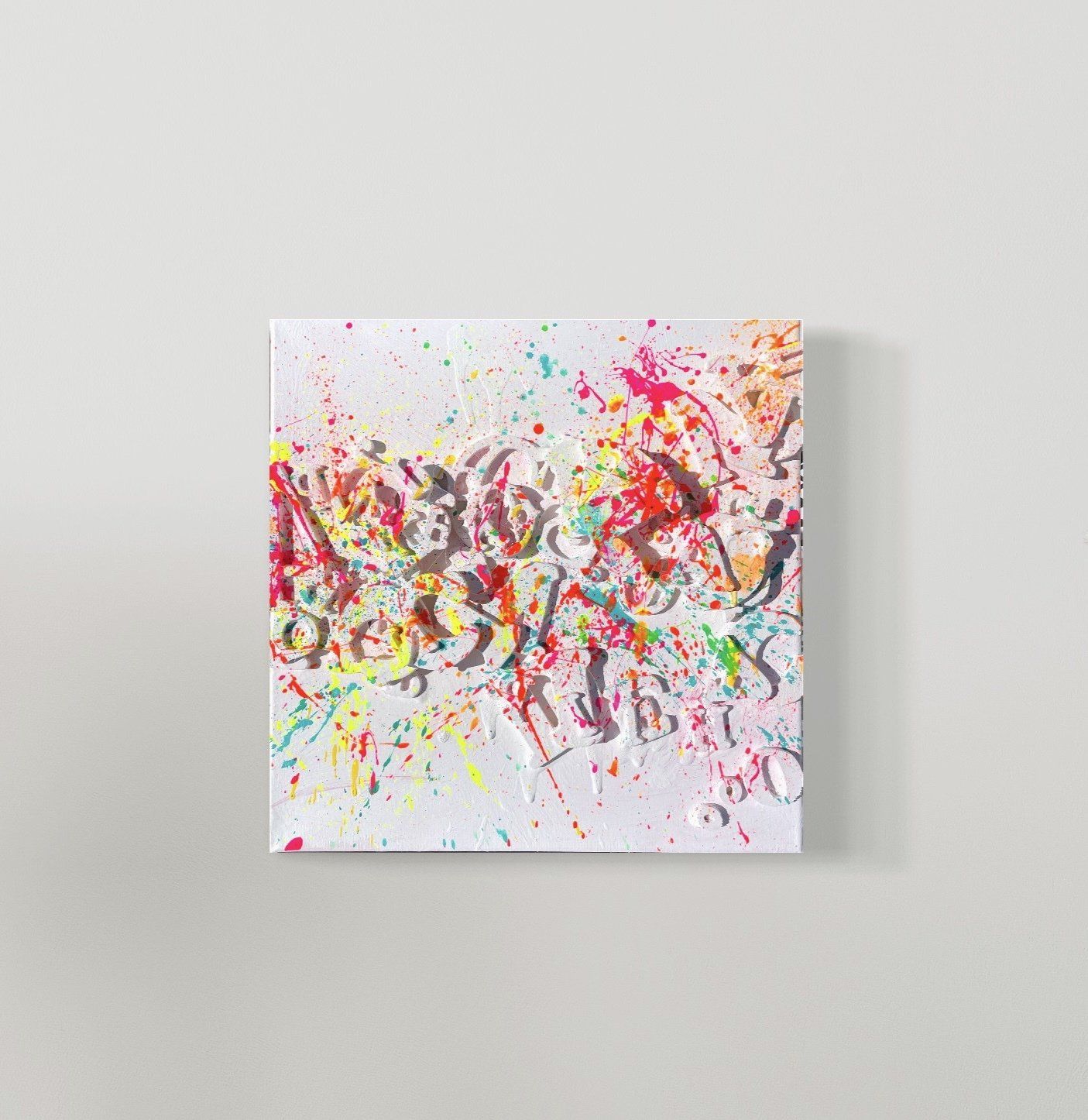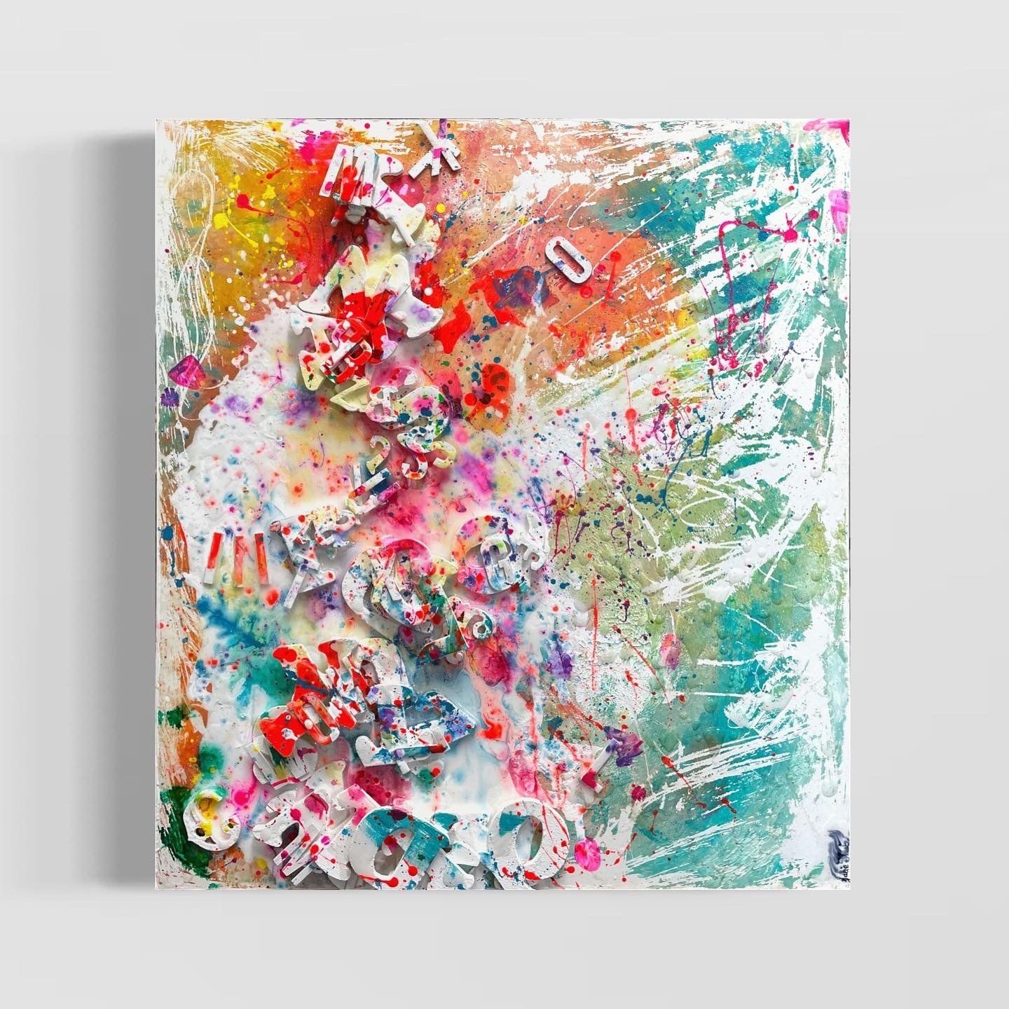 Composition de lettres superposées pour un rendu très décoratif, Peinture acrylique, taches de couleurs lumineuses, touches de résine