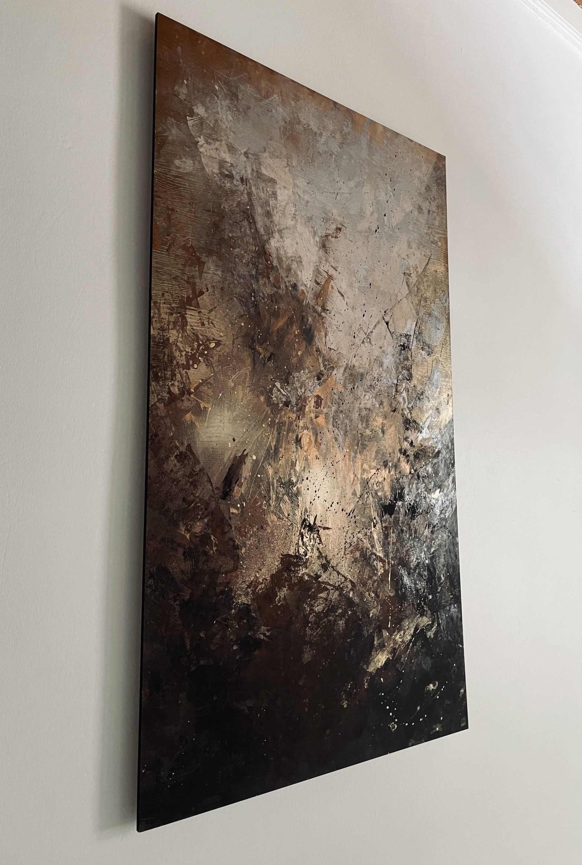 Peinture acrylique et cuir, entièrement en cuir de veau naturel, incrustations de cuir en creux et en relief, touches de résine.